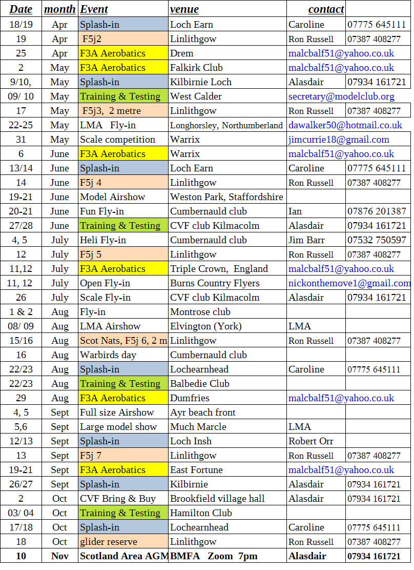 I have compiled a list of events in Scotland (and a couple outside) that should be of interest to Scotland Area Aeromodellers. Please advise any events you want added to Area chairman, under “contact us” tab. Here is the updated list (as of 11th April 2026).